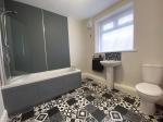 uPVC double glazed window to the side elevation with frosted effect. Single panel central heating radiator. Three piece bathroom suite in white with WC, hand wash basin with pedestal and bath. Shower unit housed onto the wall. Extractor fan. Ceiling light point.