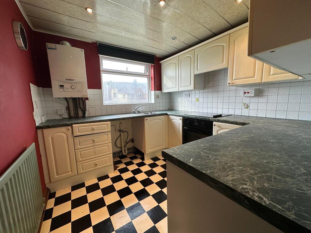 uPVC double glazed window to the rear elevation. Single panel central heating radiator. Fitted kitchen complimented by wooden cupboard doors. 'Hotpoint' induction hob. Oven and Grill. Extractor fan. Stainless steel sink and drainer. Space for a cabinet fridge, freezer and washing machine. 'Valliant' boiler housed onto the wall. Partial white tiling. Power points. Five spot lights.