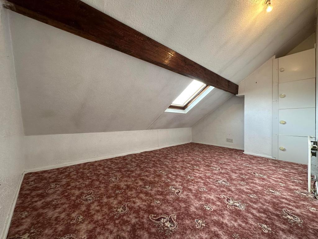 Velux window with opener and fitted blinds. Single panel central heating radiator. Single bedroom with fitted cupboards and space for a bedside table. Carpet. Power points. Ceiling light point.