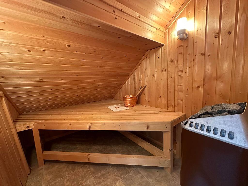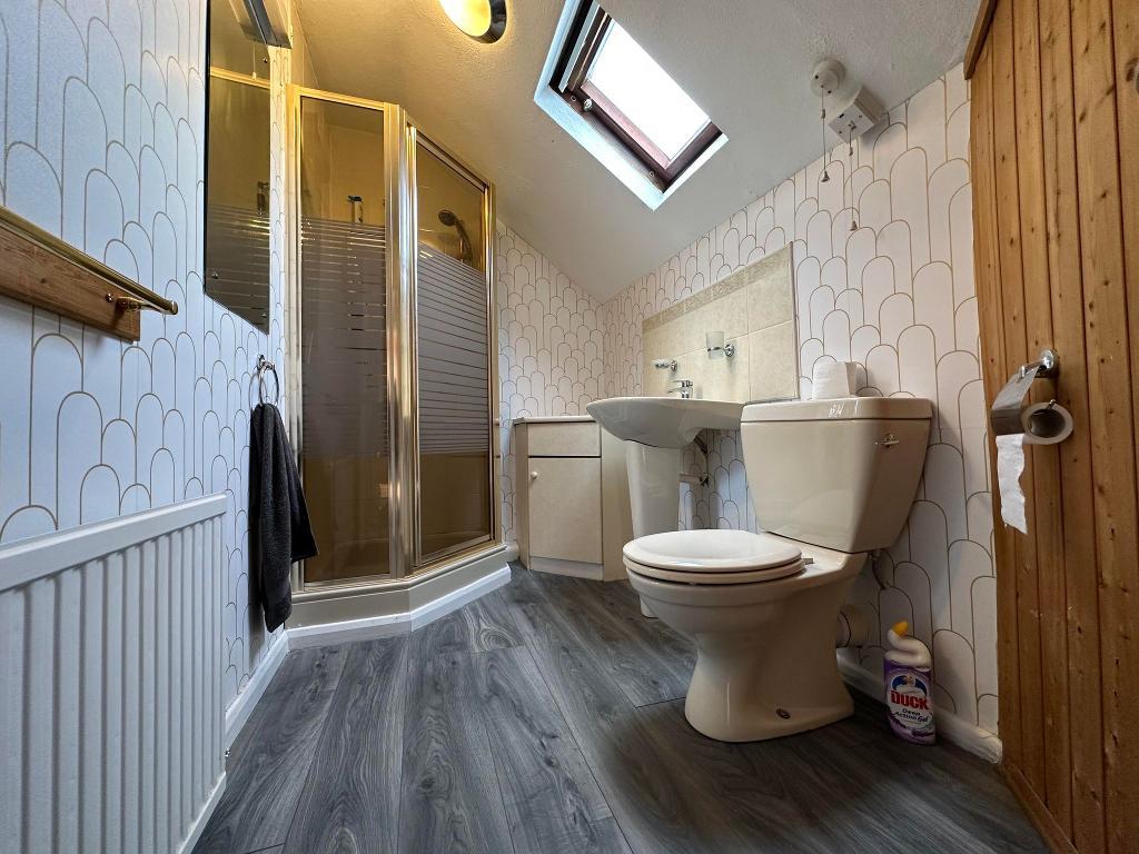 Velux window with opener. Single panel central heating radiator. Three piece with WC, hand wash basin with pedestal and shower. 'Dolphin' shower unit housed onto the wall. Access to the sauna. Partial tiling. Ceiling light point.