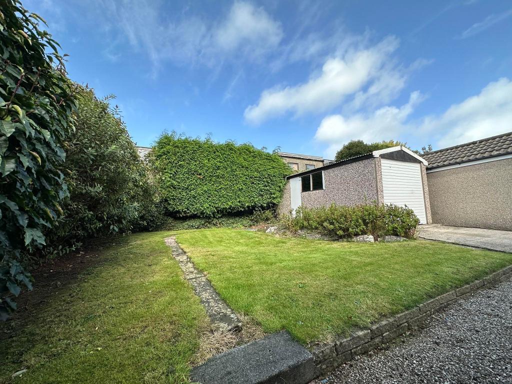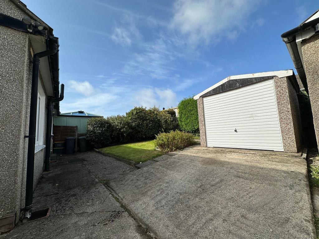 Semi detached bungalow. Driveway providing off-road parking. Access to the detached garage via a metal up and over door. Front garden with flower beds. Wooden front door leading into;