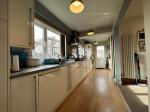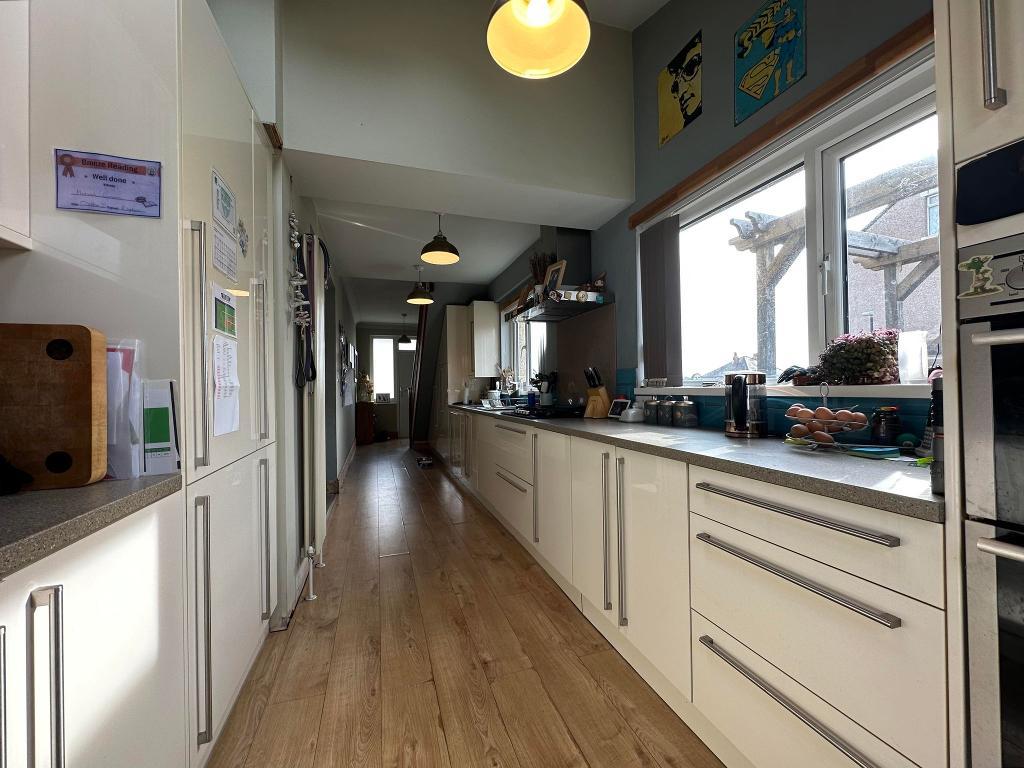 uPVC double glazed window to the side elevation. Velux window with opener. uPVC double glazed door allowing access into the rear garden. Lateral radiator in white. Open archway leading into the dining room and lounge. Fitted kitchen with laminated working surfaces accommodated with gloss cupboard doors. "AEG" Oven/Grill, Gas hob and extractor fan. Sink with drainer. Integrated fridge freezer. Built in storage cupboard housing "Glow Worm" boiler. Partial tiling. Power points. Three ceiling light points.