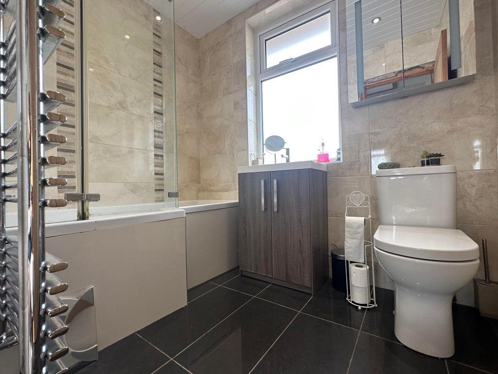 uPVC double glazed window to the rear elevation with frosted effect. Towel radiator. Three piece bathroom suite in white with WC, hand wash basin set into a vanity unit and bath. Shower unit housed onto the wall. Tiled floor to ceiling surround. Spot lights.
