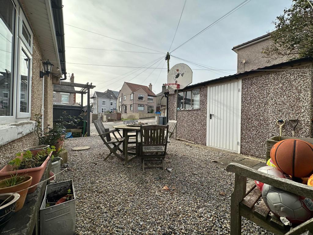 Access to the garage via an up and over metal door and side door. Stone chippings with space for a table and chairs. Access to the side and front elevation. Outside light.