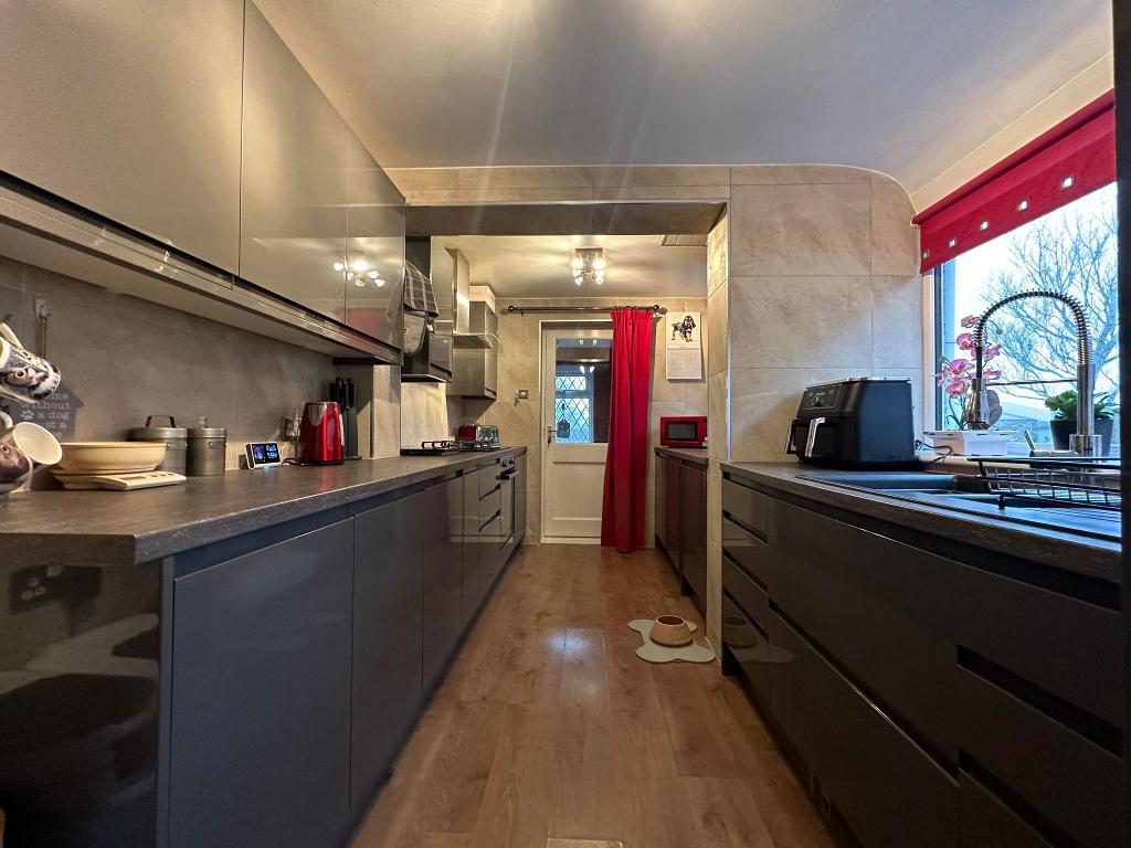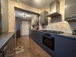 uPVC double glazed windows to the side elevation. Wooden door leading to the rear. Modern fitted kitchen with gloss cupboard doors. "Russell Hobbs" gas hob. "Beko" oven/grill. Extractor fan. Sink with drainer and mixer tap. Integrated fridge, freezer and "Lamona" dishwasher. Space for a washing machine. Tiled floor to ceiling surround. Power points. Two ceiling light points.