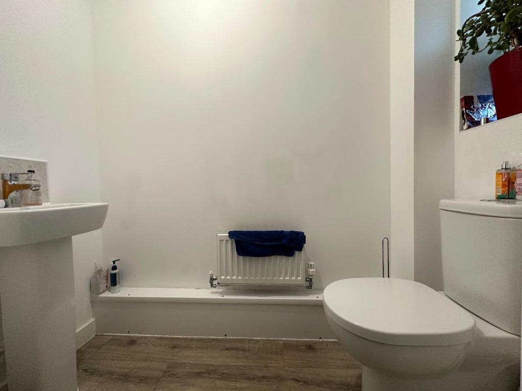 uPVC double glazed window to the front elevation. Single panel central heating radiator. Two piece in white with WC and hand wash basin. Main switch board housed onto the wall. Ceiling light point.