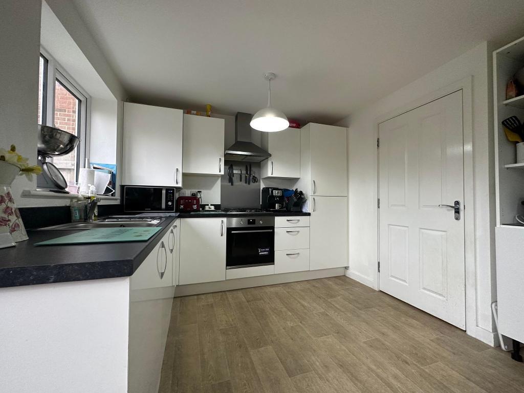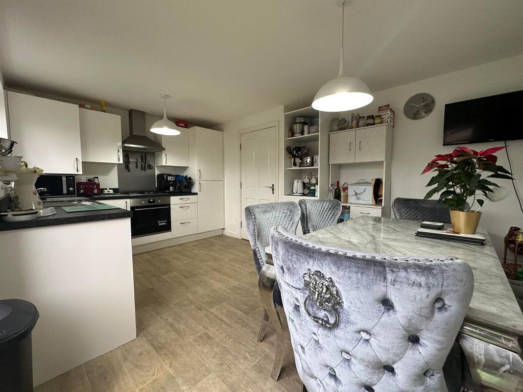 uPVC double glazed window to the rear elevation. uPVC French doors allowing access to the garden. Double panel central heating radiator. Fitted kitchen with black laminated working surfaces accommodated with white cupboard doors. "Electrolux" oven/Grill. Gas hob. Extractor fan. Stainless steel with drainer. "Ideal" boiler housed onto the wall. Integrated fridge, freezer and "Zanussi" washing machine. Television point. Power points. Two ceiling light points.