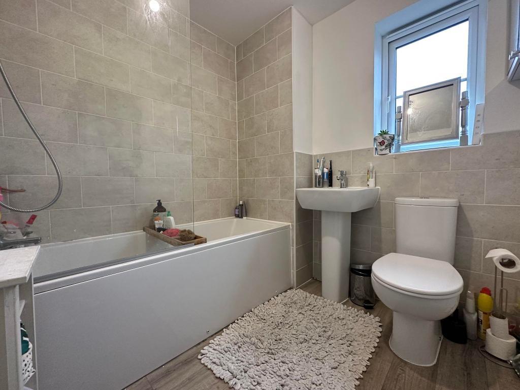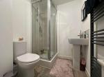 uPVC double glazed window to the front elevation with frosted effect. Towel radiator. Three piece bathroom suite in white with WC, hand wash basin with pedestal and bath. "Mira" shower unit housed onto the wall. Partial tiling. Ceiling light point.