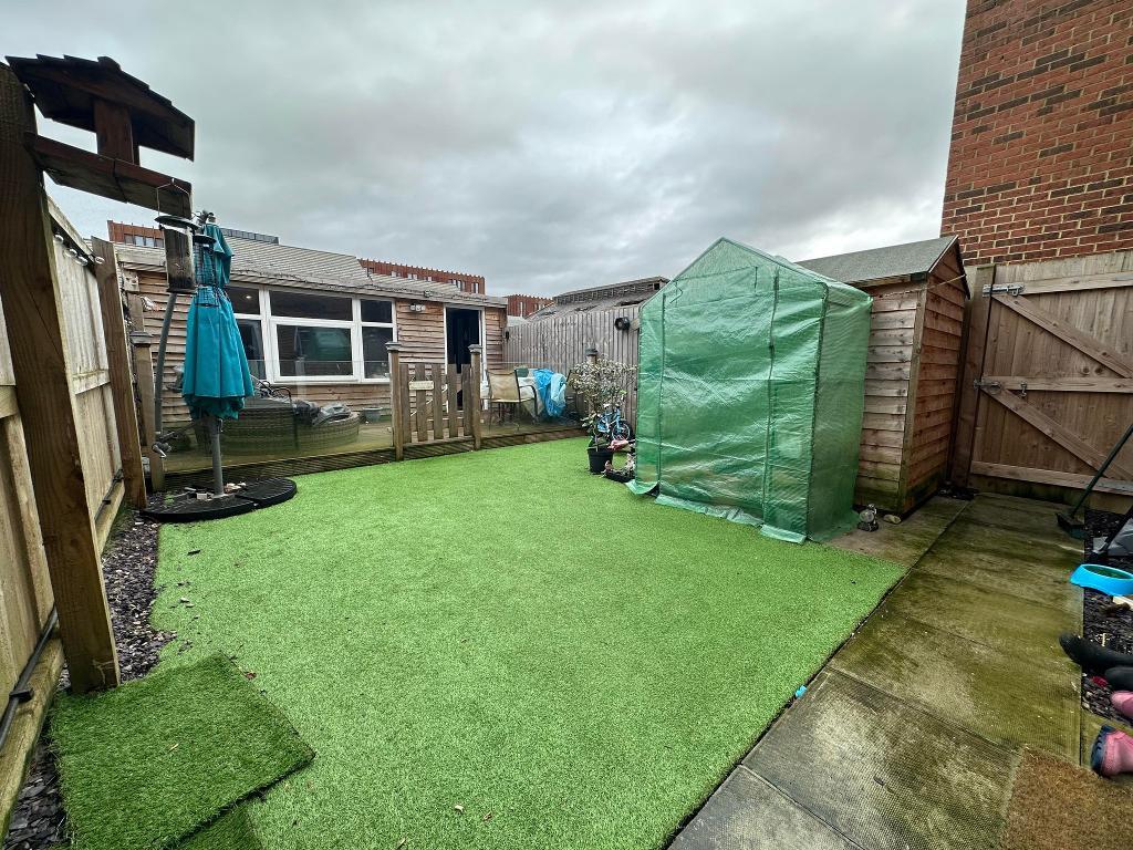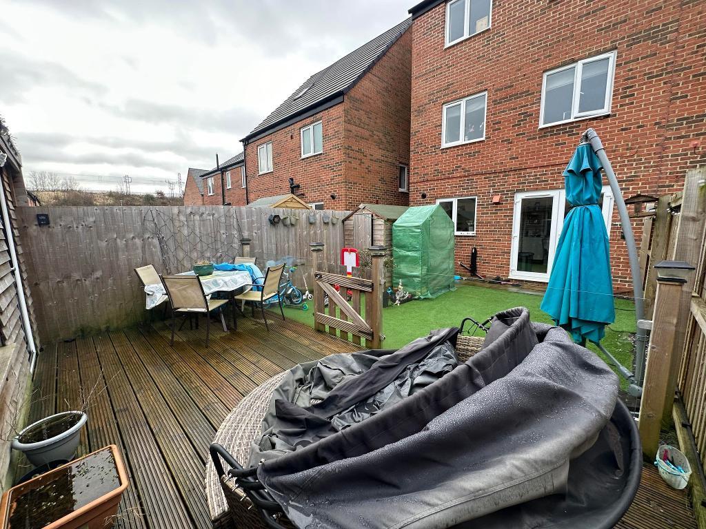 Combination of stone paving, artificial grass and raised decking. Stone chippings around the borders. Access to the garden room via uPVC double glazed door. Side gate allowing access to the side elevation. Power points. Outside light point.
