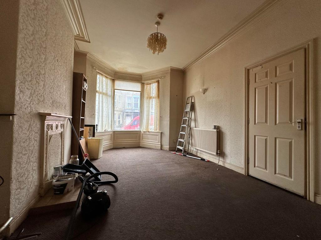 uPVC double glazed bay window to the front elevation. Single panel central heating radiator. Open access into the kitchen. Television point. Switch board housed onto the wall. Original coving. Carpet. Power points. Two wall light points. Ceiling light point.